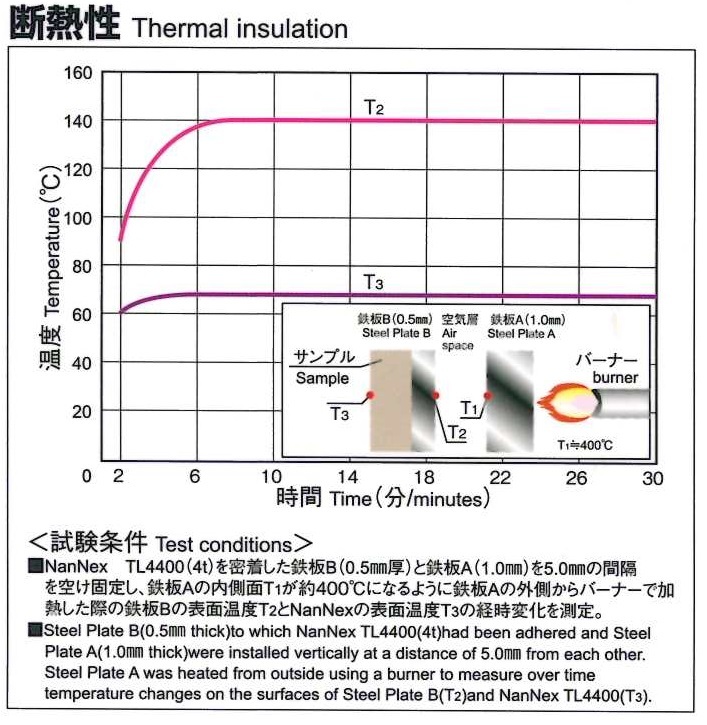 <試験条件>■TL4400の4Tを密着した鉄板B(0.5mm厚)と鉄板A(1.0mm厚)を5mmの間隔をあけ固定し、鉄板Aの内側面T1が約400℃になるように鉄板Aの外側からバーナーで加熱した際の鉄板Bの表面温度T2とナンネックスの表面温度T3の経時変化を測定したグラフ