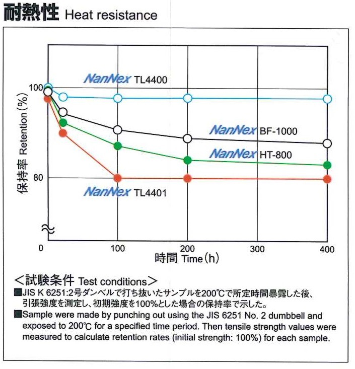 <試験条件>■JIS K6251:2号ダンベルで打ち抜いたサンプルを200℃で所定時間暴露した後、引張り強度を測定し、初期強度を100%とした場合の保持率で示したグラフ